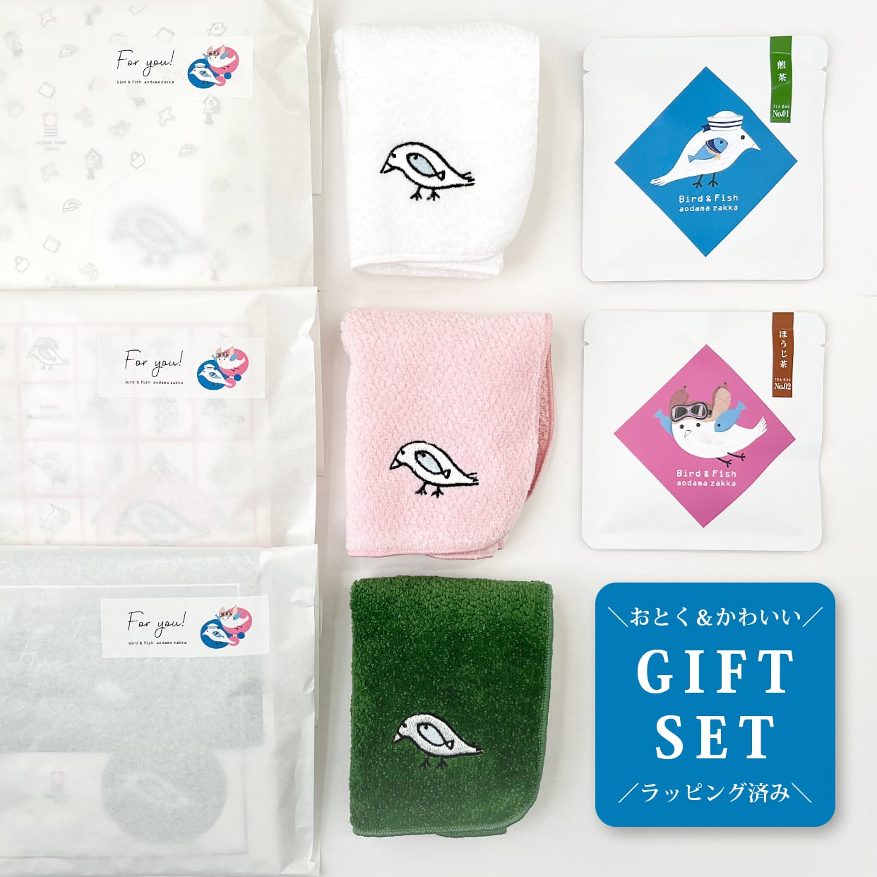 ※ねこぜちゃんグッズを含むご注文は発送までにお時間いただきます※ 【あおだま雑貨店オリジナル雑貨シリーズ】 当店オリジナルキャラクター『ねこぜちゃん』をモチーフにした、今治タオルハンカチとティーバッグのギフトセットです。 簡易ラッピングをした状態でお送りいたしますのでそのままお渡しいただけます。 (ご購入時に配送先をお相手宛にしていただくこともできます) 日常にそっと寄り添うやさしいアイテムを選び、受け取った方がほっとできる内容にまとめました。 季節のご挨拶や、ささやかな贈り物にも安心してお渡しいただける、あおだま雑貨店限定のセットです。 日常にちょっとした幸せをプラスするこのセットをぜひどうぞ。 【販売価格】 ■特別価格:1,658円(15%OFF) ↑↑↑↑↑ ■通常価格:1,950円 (ハンカチ1枚1,400円、ティーバッグ2Pセット550円) 【セット内容】 ・今治タオルハンカチ × 1枚(3色からお選びいただけます) ・ティーバッグ(煎茶)× 1袋 ・ティーバッグ(ほうじ茶)× 1袋 ・簡易ラッピング済み(開封後すぐにお渡し可能です) 【こだわりポイント】 ・今治タオルハンカチは、やわらかな肌ざわりと確かな品質で、幅広い年代の方に安心してお使いいただけます。 ・ティーバッグは、山形の老舗茶屋「茶蔵」さんに作っていただいた煎茶とほうじ茶の2種類をご用意。 どなたにも飲みやすい香りと味わいで、気負わず贈れる内容になっています。 ・当店オリジナルキャラクター「ねこぜちゃん」のデザインは、かわいらしさの中にも落ち着きがあり、さりげない贈り物として選ばれています。 【簡易ラッピングについて】 商品をセットで白い紙袋に入れ、オリジナルの「For You!」シールを貼って簡易ラッピングをした状態でお届けします。 そのままプレゼントとしてお渡しもできますし、ご自身へのプレゼントにも♪ ○甘いものはちょっと…という方へ、バレンタインやホワイトデーギフトとして ○卒業、卒園時のご挨拶のおともに ・・・など、ご挨拶やちょっとしたお礼を伝えたい時にも、ご負担の少ない気持ちのギフトとしてご利用いただけます。 ----- 【ハンカチ、お茶の詳細】 更なる詳細は、大変お手数ですが各商品ページをご確認ください。 ▼今治タオルハンカチ https://aodama.buyshop.jp/items/127894227 肌触り抜群の今治タオルハンカチは、吸水性が高くてふんわり柔らかい仕上がり。 シンプルだけど、ねこぜちゃんの刺繍が可愛くて、持っているだけで毎日の生活をちょっと楽しくしてくれるかも。 お出かけやオフィス使いにも最適です。 ■サイズ:(約)22×22cm ■素材:綿 ■生産地:愛媛県今治市 ▼ティーバッグ2Pセット https://aodama.buyshop.jp/items/133804967 当店オリジナルパッケージの美味しい煎茶&ほうじ茶。 忙しい日のほっと一息つく時間に、ぜひどうぞ。 お好みの濃さで楽しんでください。 ■内容量:煎茶5g×1袋、ほうじ茶3g×1袋 ■原材料名:煎茶→緑茶、ほうじ茶→炒り米(山形県産つや姫)、緑茶 ■賞味期限:本体裏記載※現在販売しているものは2026年10月6日まで ■保存方法:高温多湿を避け、移り香にご注意ください。 ■おもな原産地:国産 ■加工者:株式会社桑名園本店 --- ※ご了承ください※ ★お使いのモニター設定、お部屋の環境などにより実際の商品と色味が異なる場合がございます。 ★イメージ違いによる返品はお受けできませんので、あらかじめご了承ください。 ▼ハンカチ ・製造工程の都合上、数mm~10mm程度のサイズ差がある場合がございます。 ・刺繍にも多少の個体差があります。 ・手作業による製造のため、写真とイメージが若干異なる場合がございます。 ・使い始めは若干色落ちしたり毛羽がでやすい場合があるため、他の物と分けてお洗濯してください。 ・タオルから出る毛羽が他の衣類に付着したり絡まる可能性があるため、必ず洗濯ネットをご使用ください。 ・塩素系漂白剤の使用は色落ちの原因となりますのでお避けください。 ・柔軟剤の過度な使用は吸水性を損なう原因となりますので、硬さを感じたときからのご使用をおすすめします。 ・綿製品ですので、洗濯後に若干縮むことがあります。 ・硬いもので強く擦るとほつれが生じる可能性があります。ご注意ください。 ・直射日光やライトに長時間さらすと変色する可能性がありますのでご注意ください ・お使いのモニター設定、お部屋の環境などにより実際の商品と色味が異なる場合がございます。 ▼ティーバッグ ・パッケージには一枚ずつシールを手作業で貼っています。  多少のズレや、わずかな汚れ、わずかに印刷の色のばらつきがある場合があります。 ・パッケージは硬いもので強く擦ると傷がついたり印刷の剥がれが生じる可能性があります。ご注意ください。 =============== 可愛い かわいい オシャレ おしゃれ お洒落 ギフト プレゼント 贈り物 プチギフト プチプレゼント 誕生日 クリスマス 母の日 ホワイトデー お返し 鳥雑貨 =============== ★★★★★★ ▼ティーバッグ2Pセットの販売はこち