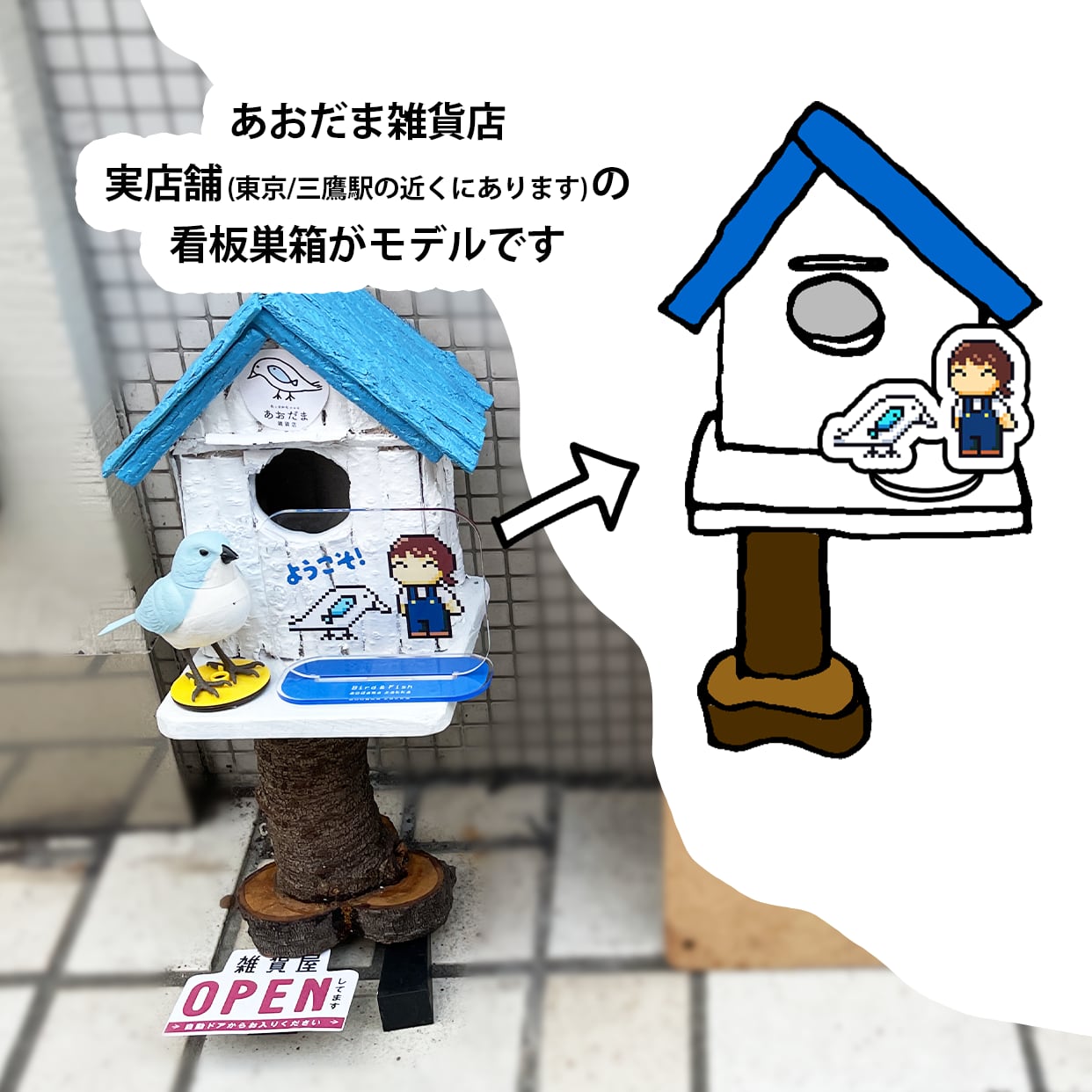 実店舗の看板として使っている巣箱をイラスト化しました。