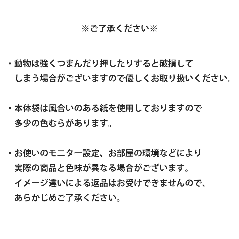 ・動物は強くつまんだり押したりすると破損してしまう場合がございますので優しくお取り扱いください。