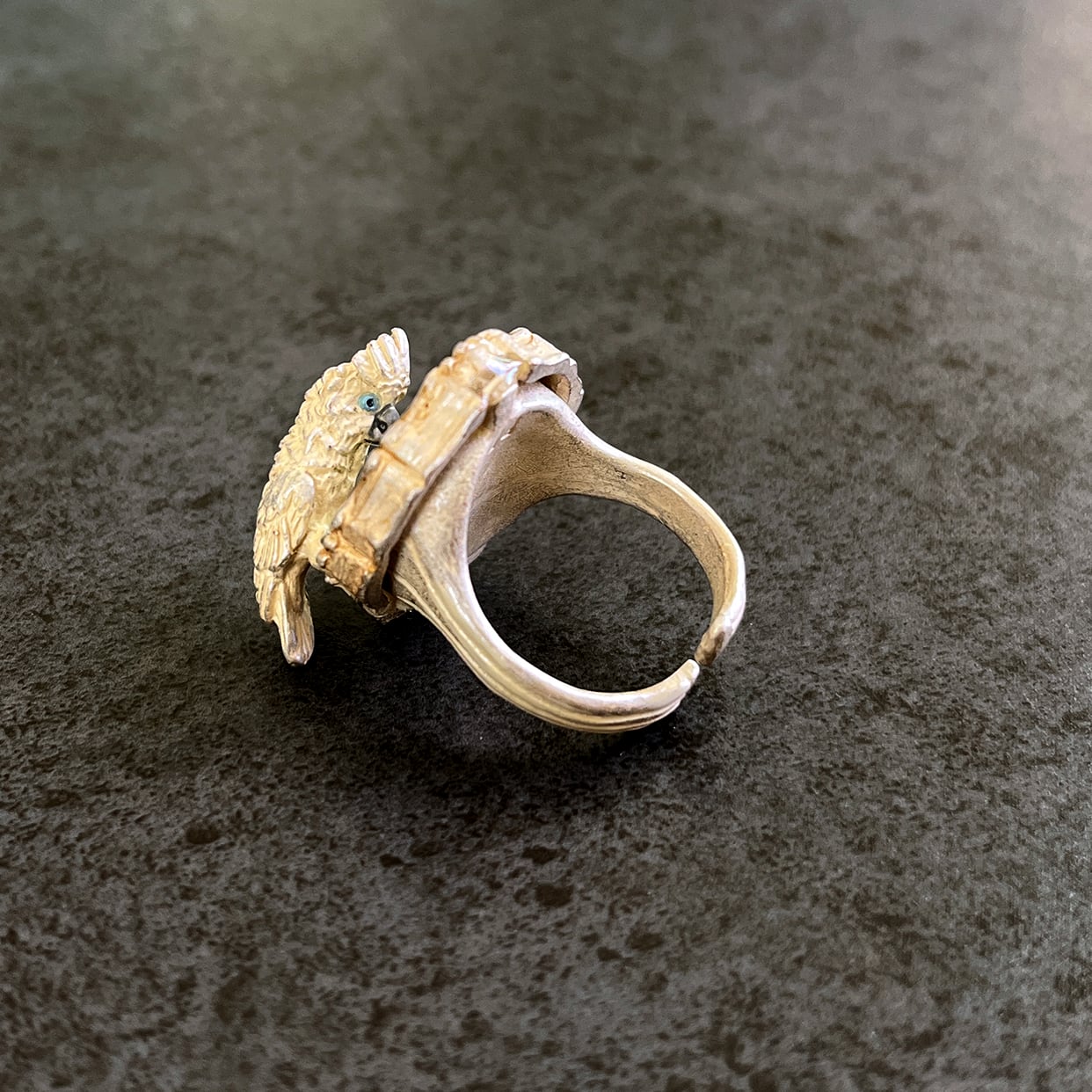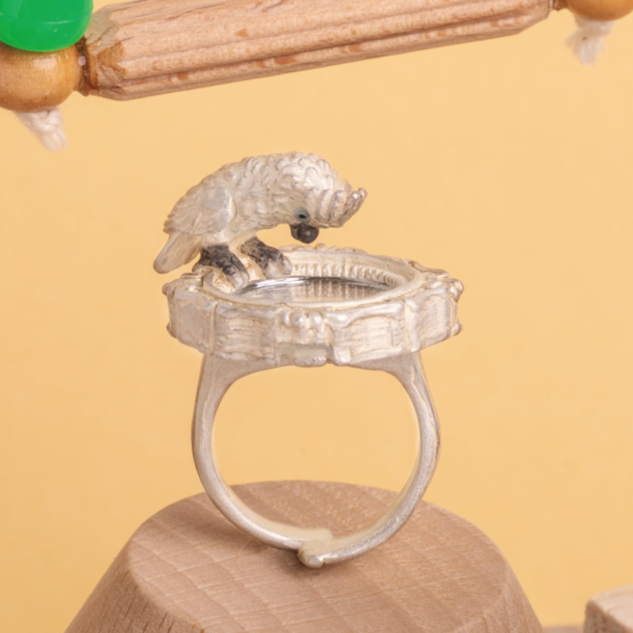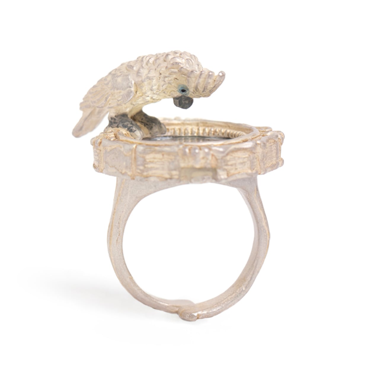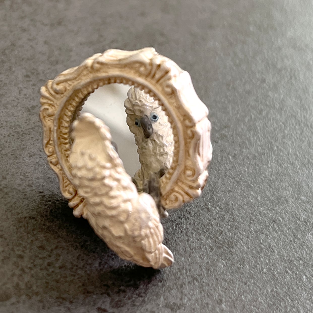 鏡をのぞき込むタイハクオウムをモチーフにしたリング。