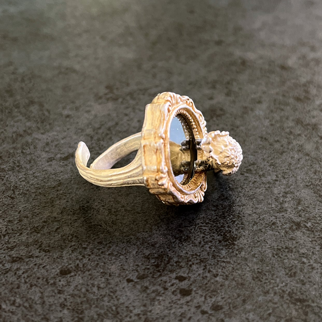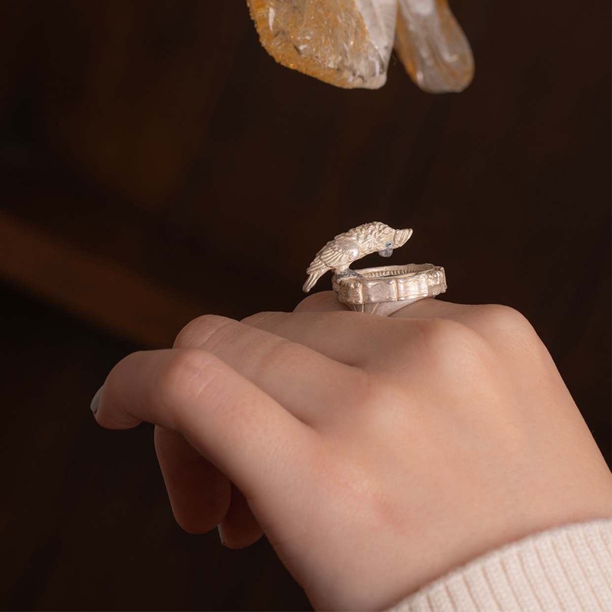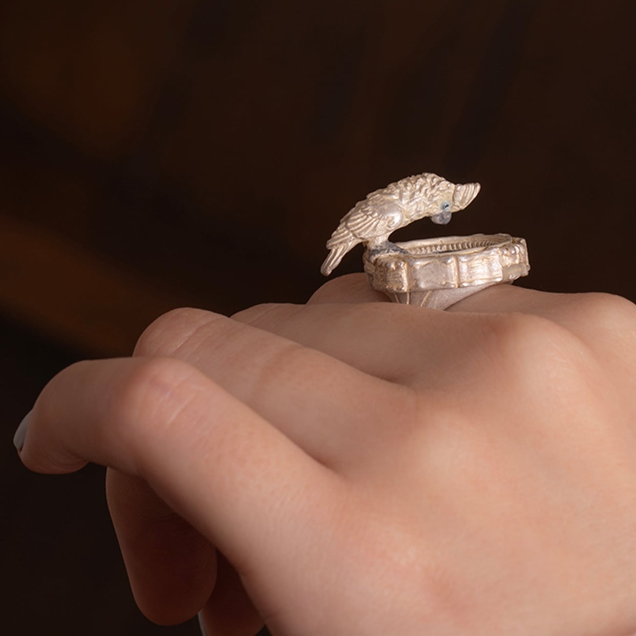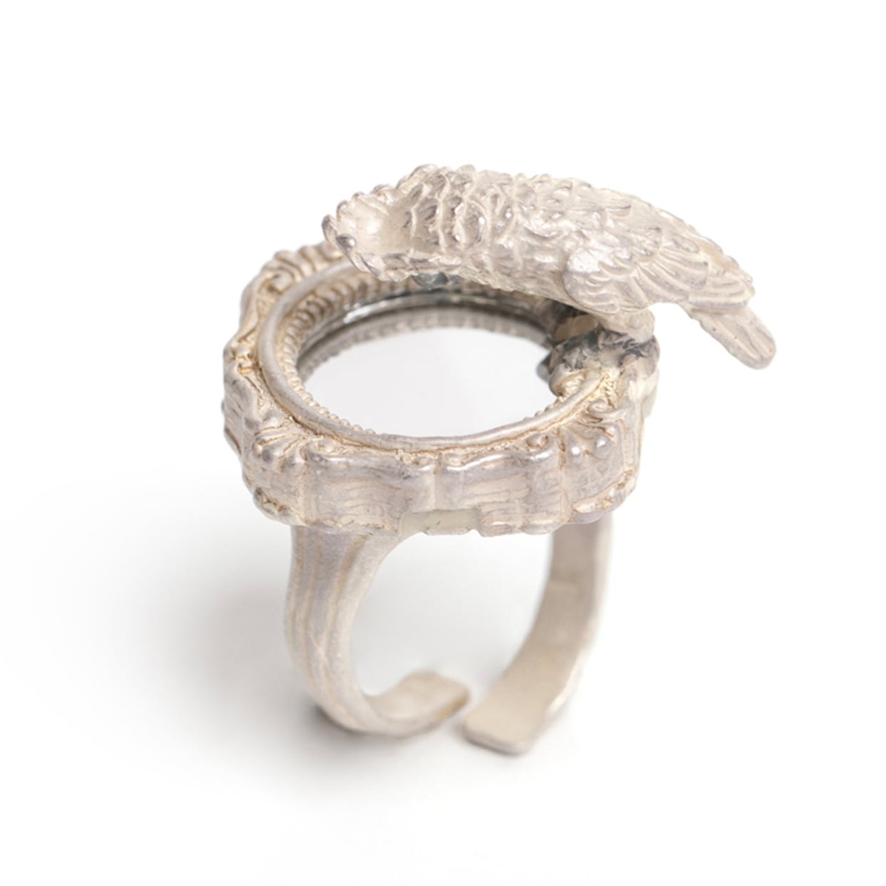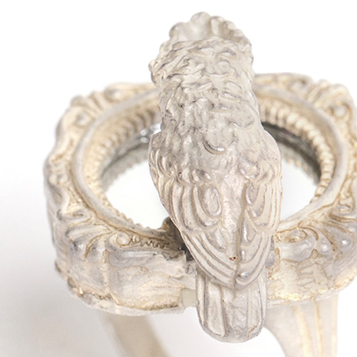 鏡をのぞき込むタイハクオウムをモチーフにしたリング。