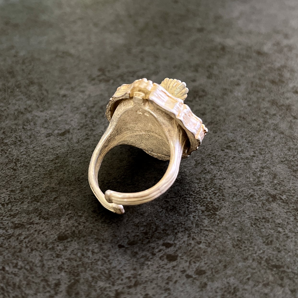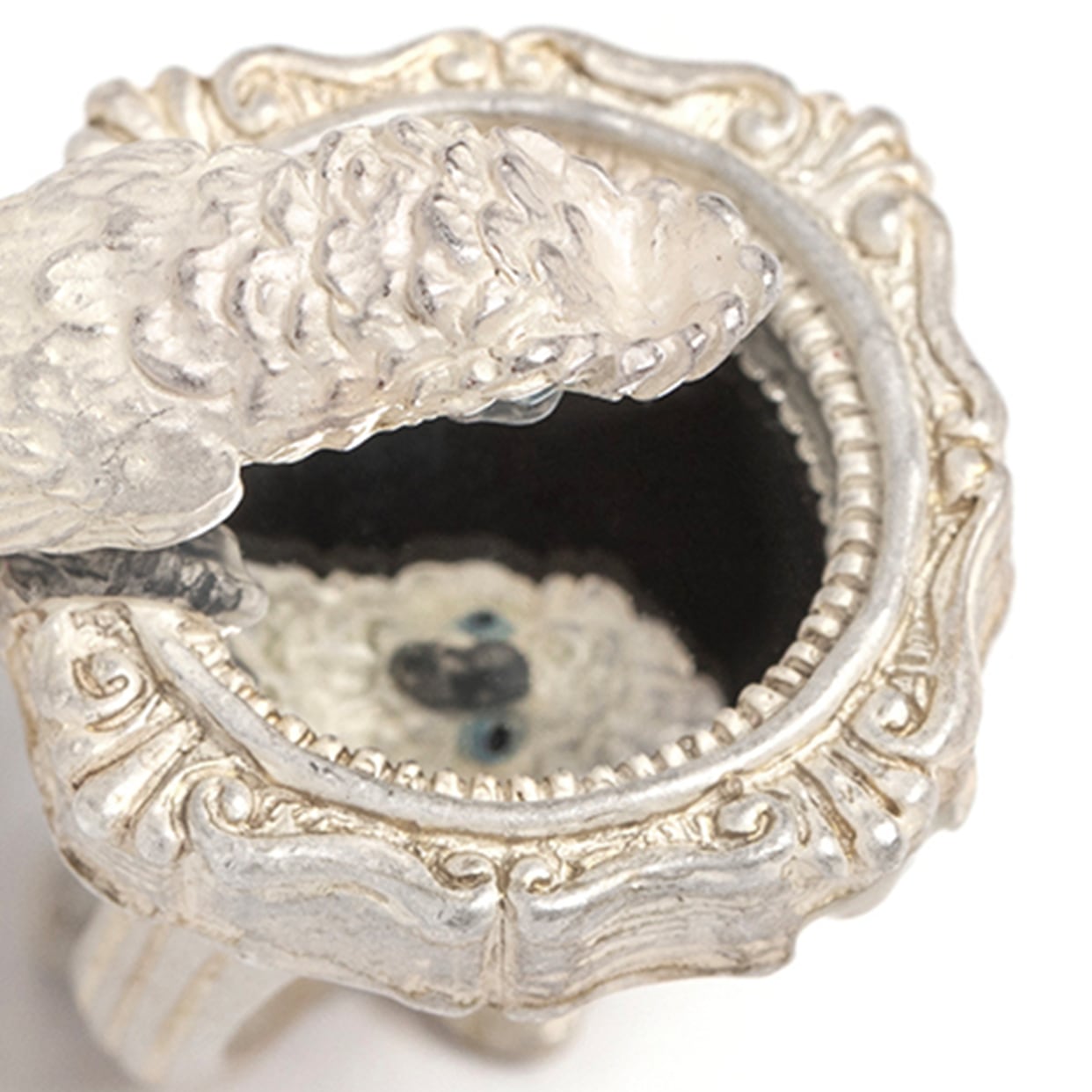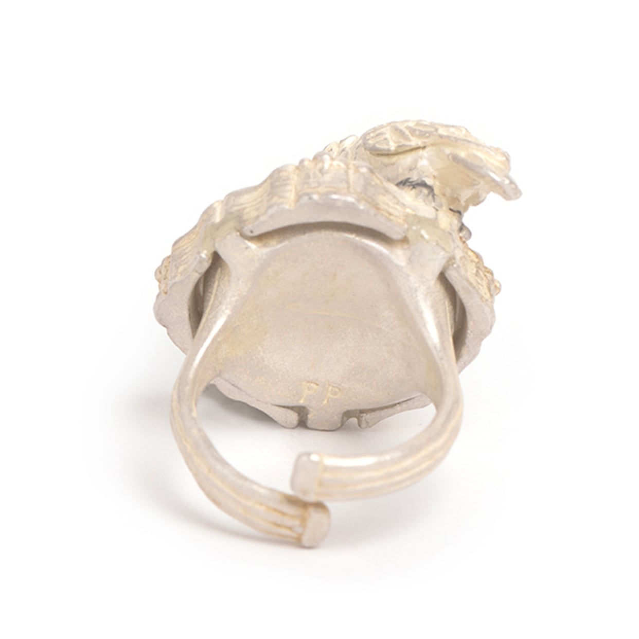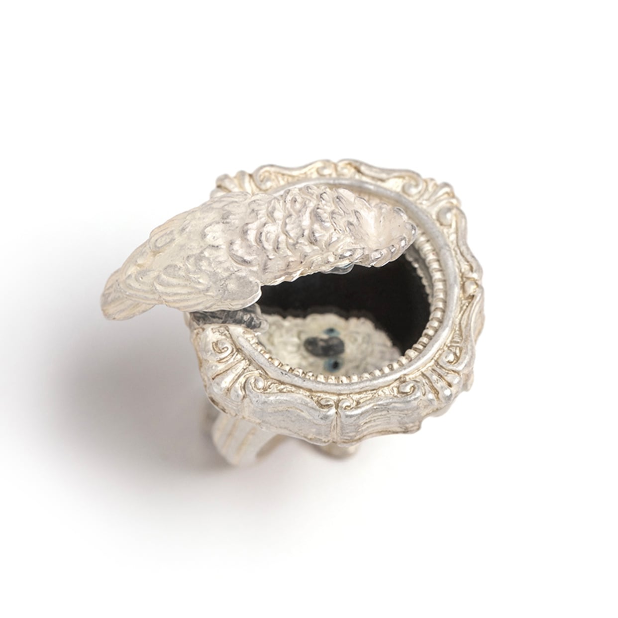 鏡をのぞき込むタイハクオウムをモチーフにしたリング。
