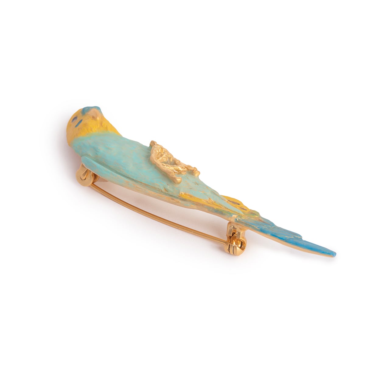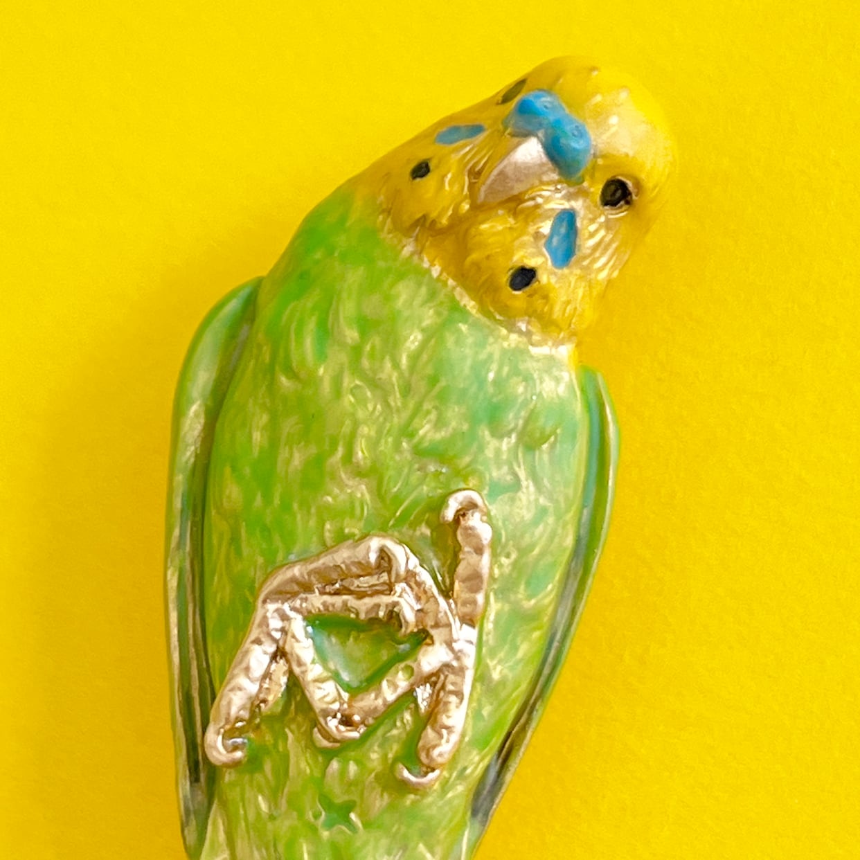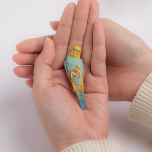 手のひらの上でまったりとリラックスするセキセイインコをモチーフにしたブローチ。