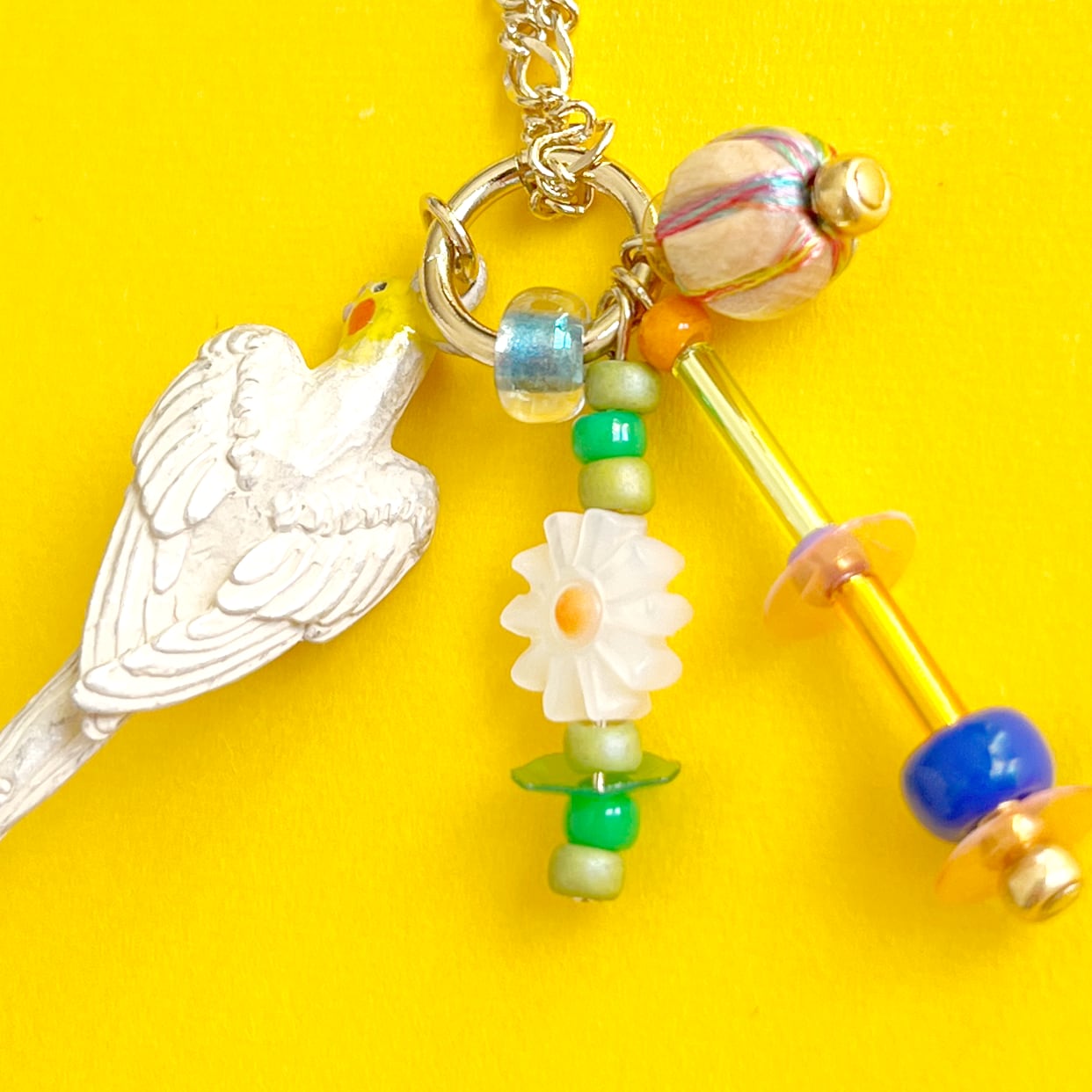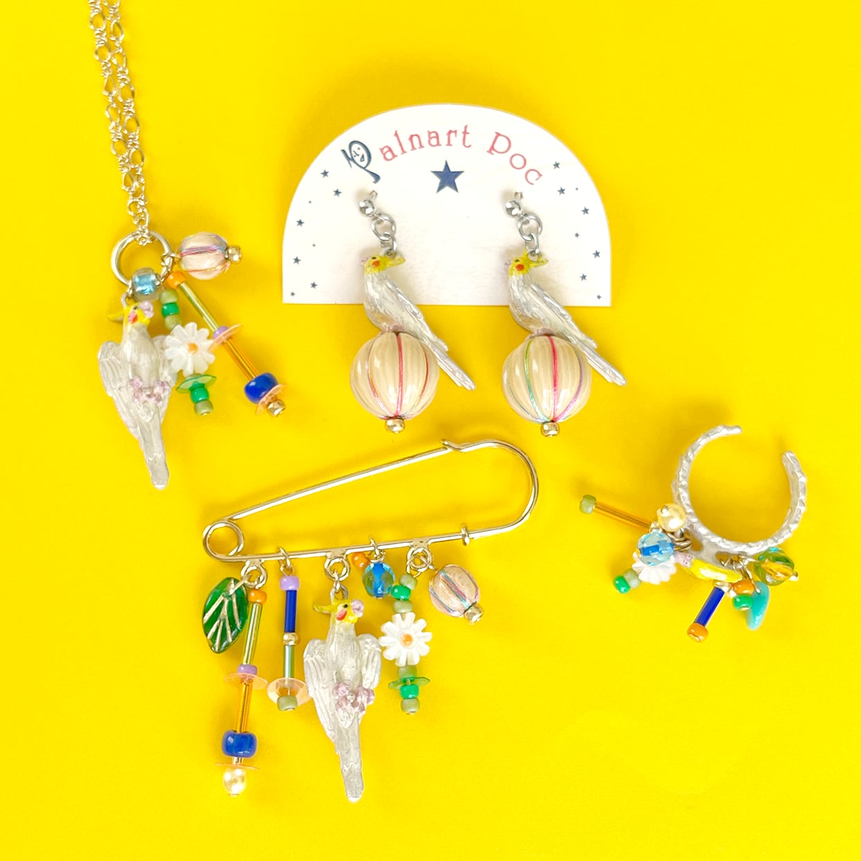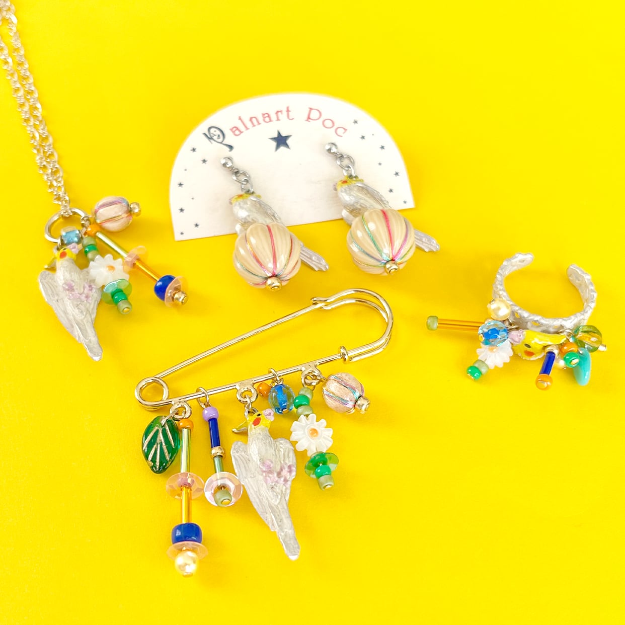 オカメインコの求愛の歌をイメージして、色も形も異なるビーズやスパンコールを散りばめ、賑やかで楽しいアクセントをプラス。