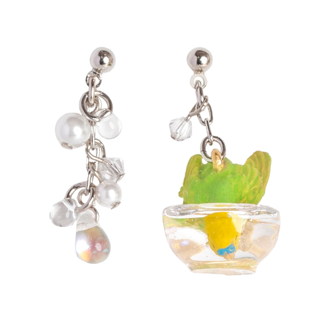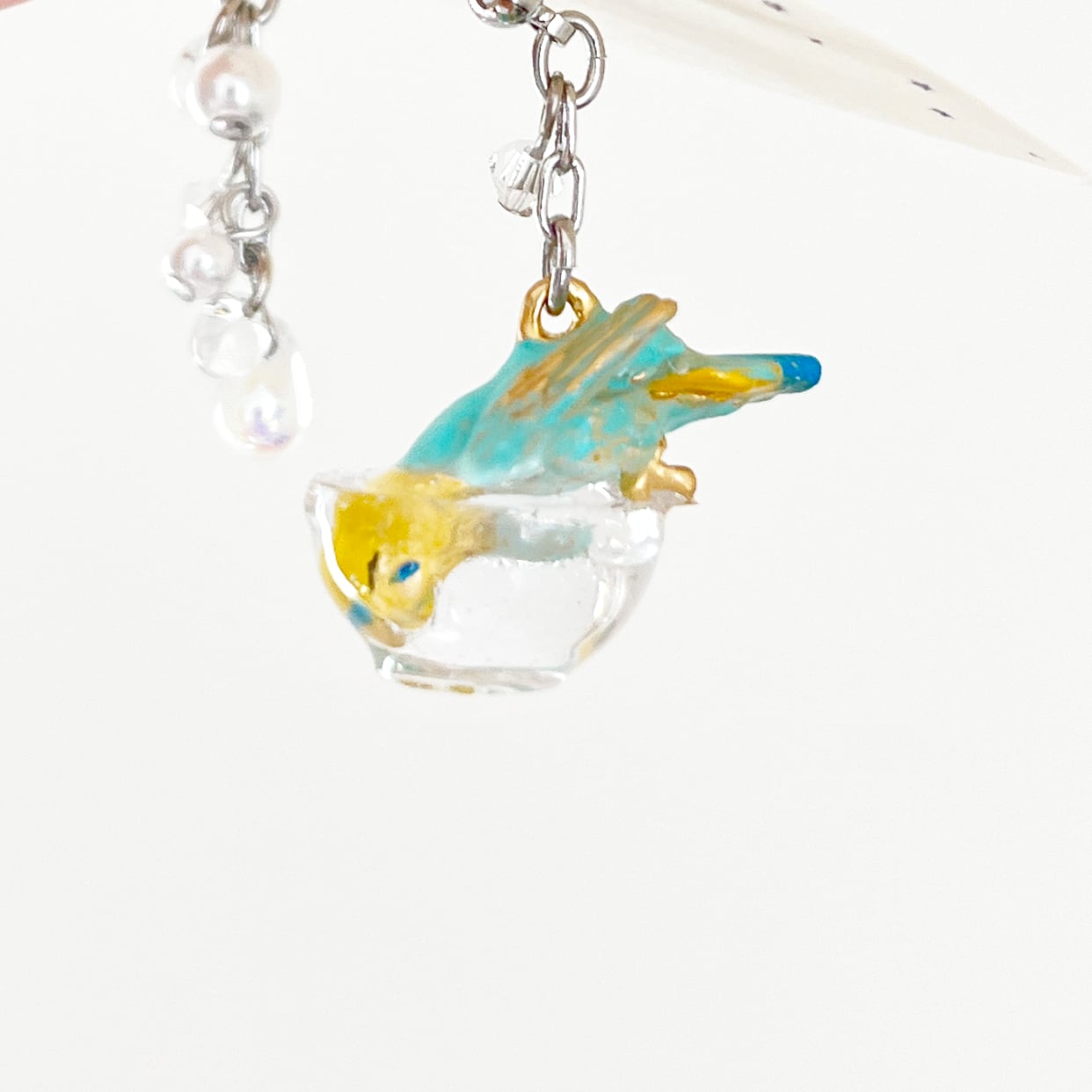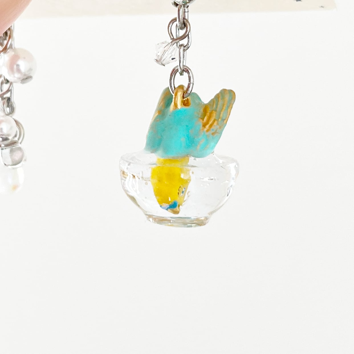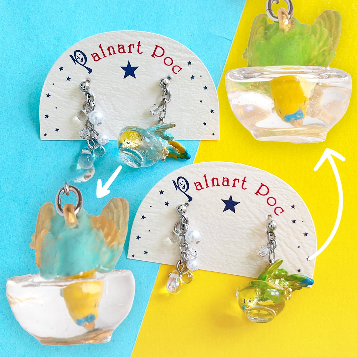 もう片方のピアスには、水しぶきをイメージしたビーズがキラキラと揺れ、豪快に水浴びするセキセイインコの姿を際立たせます。