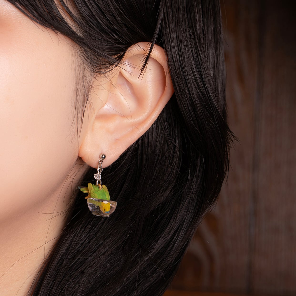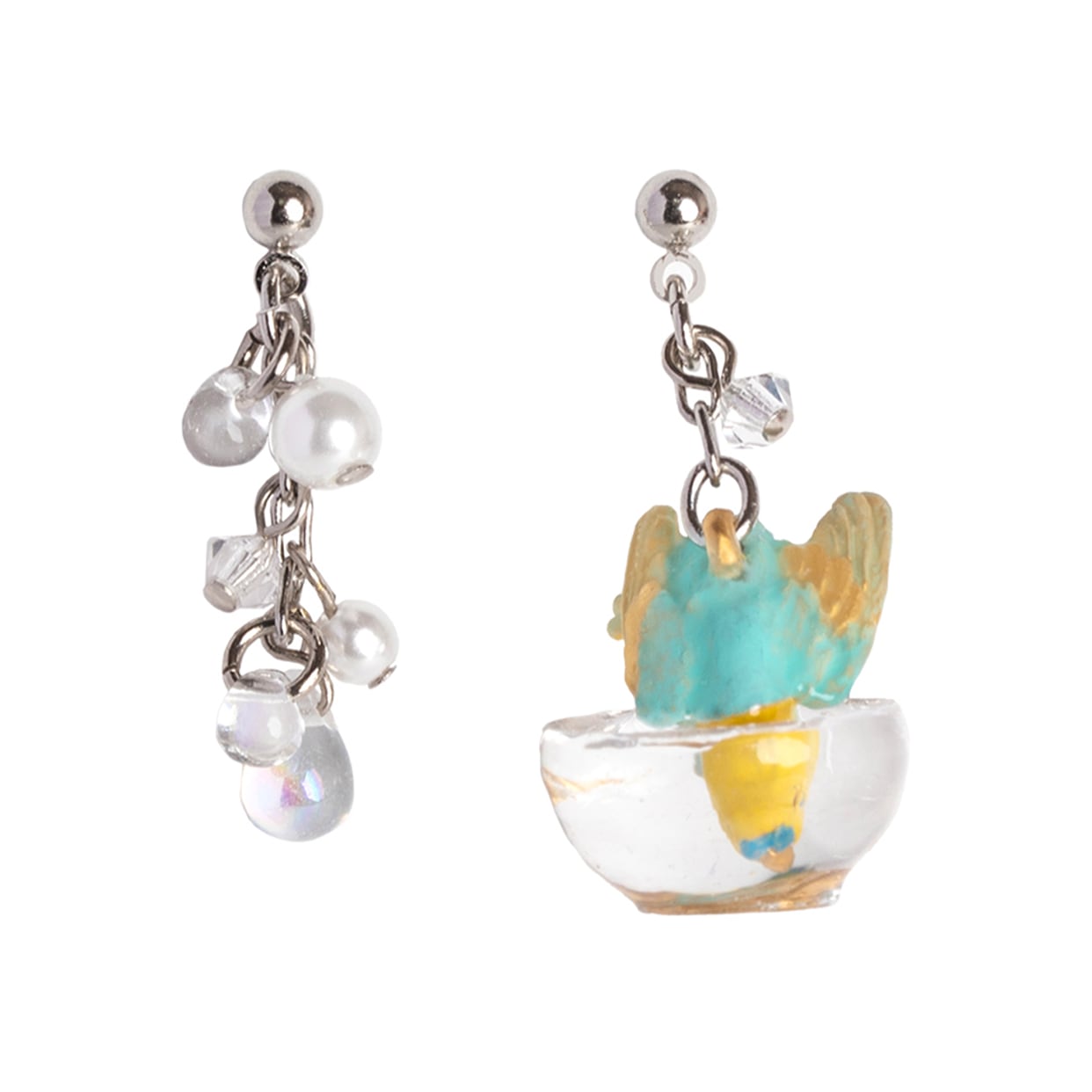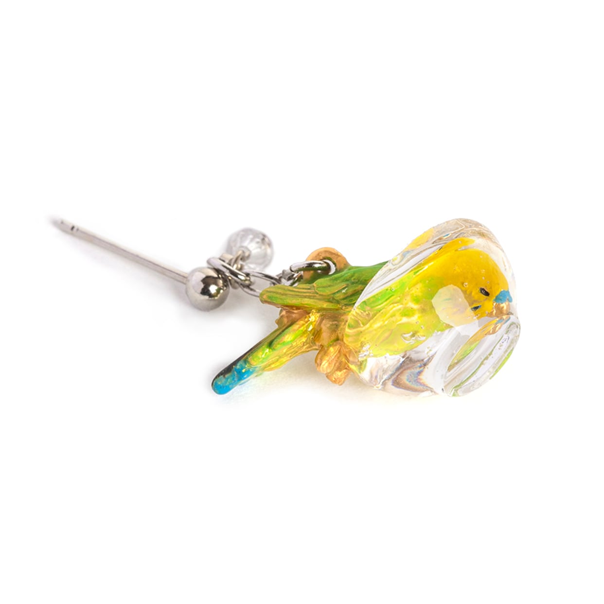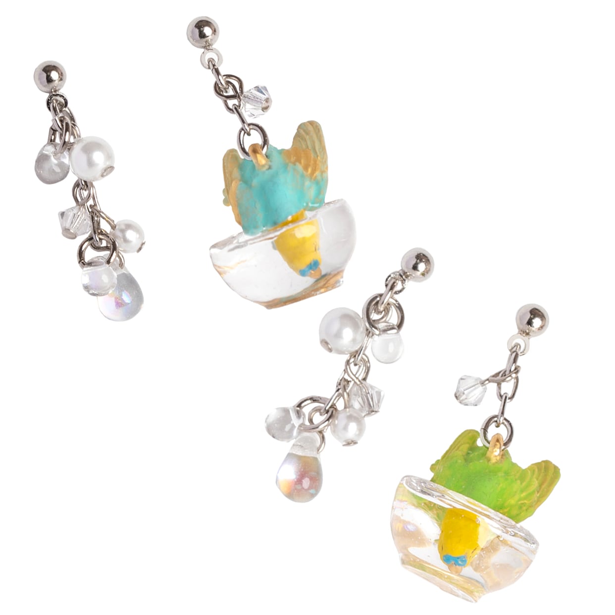 もう片方のピアスには、水しぶきをイメージしたビーズがキラキラと揺れ、豪快に水浴びするセキセイインコの姿を際立たせます。