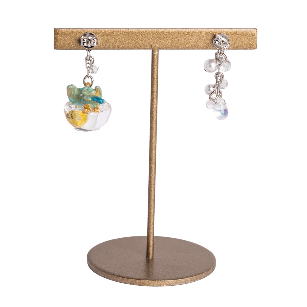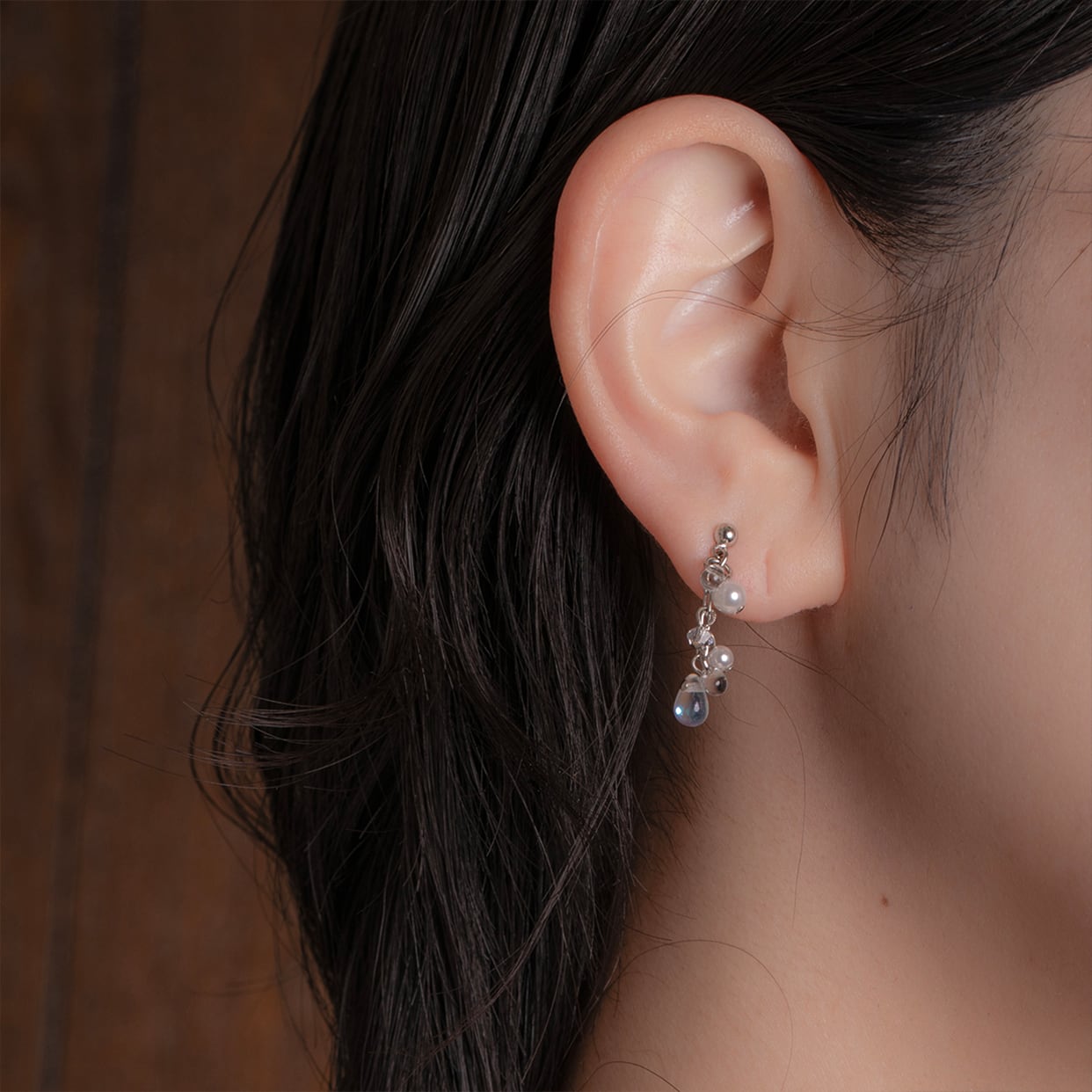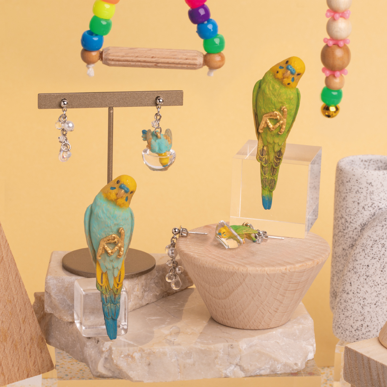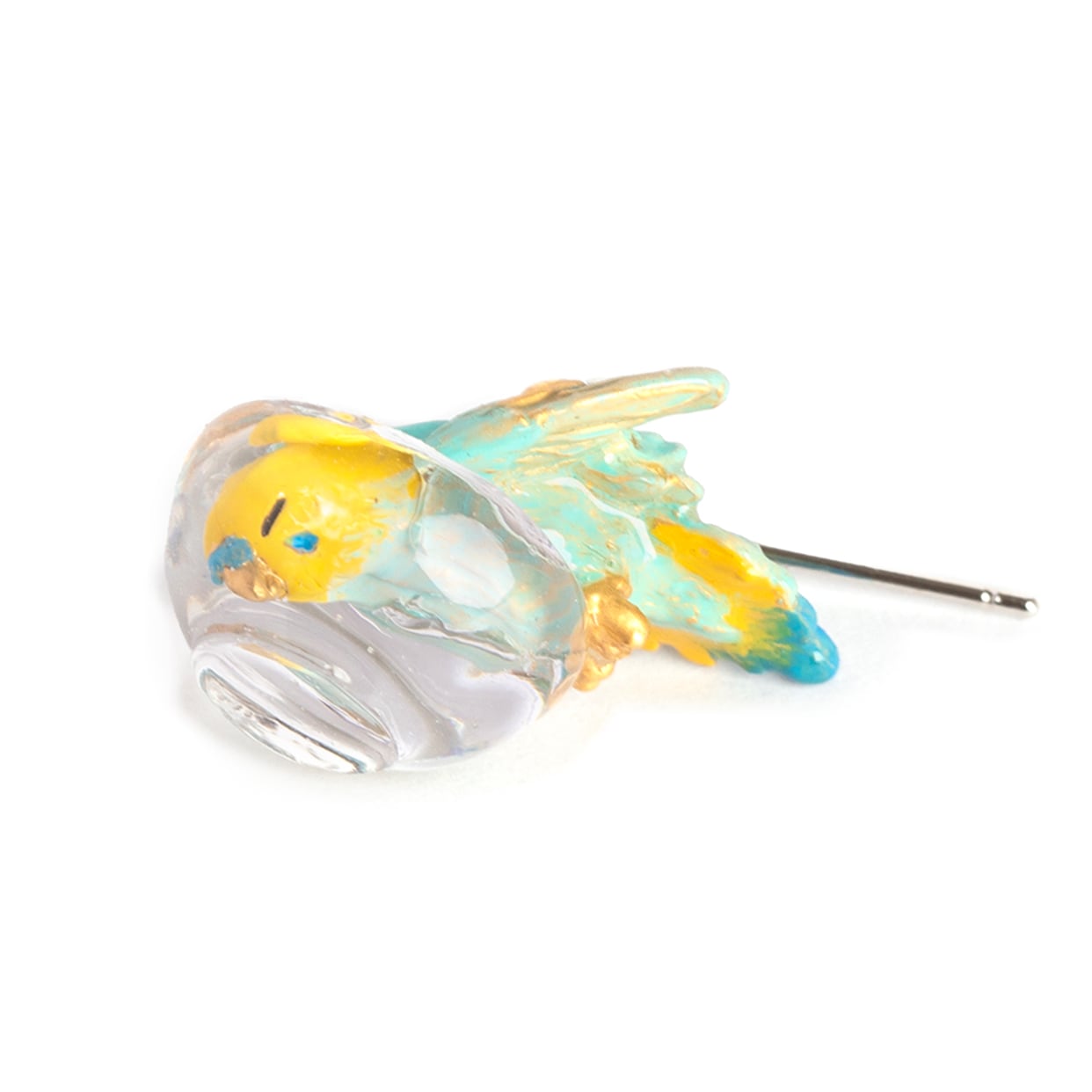 もう片方のピアスには、水しぶきをイメージしたビーズがキラキラと揺れ、豪快に水浴びするセキセイインコの姿を際立たせます。