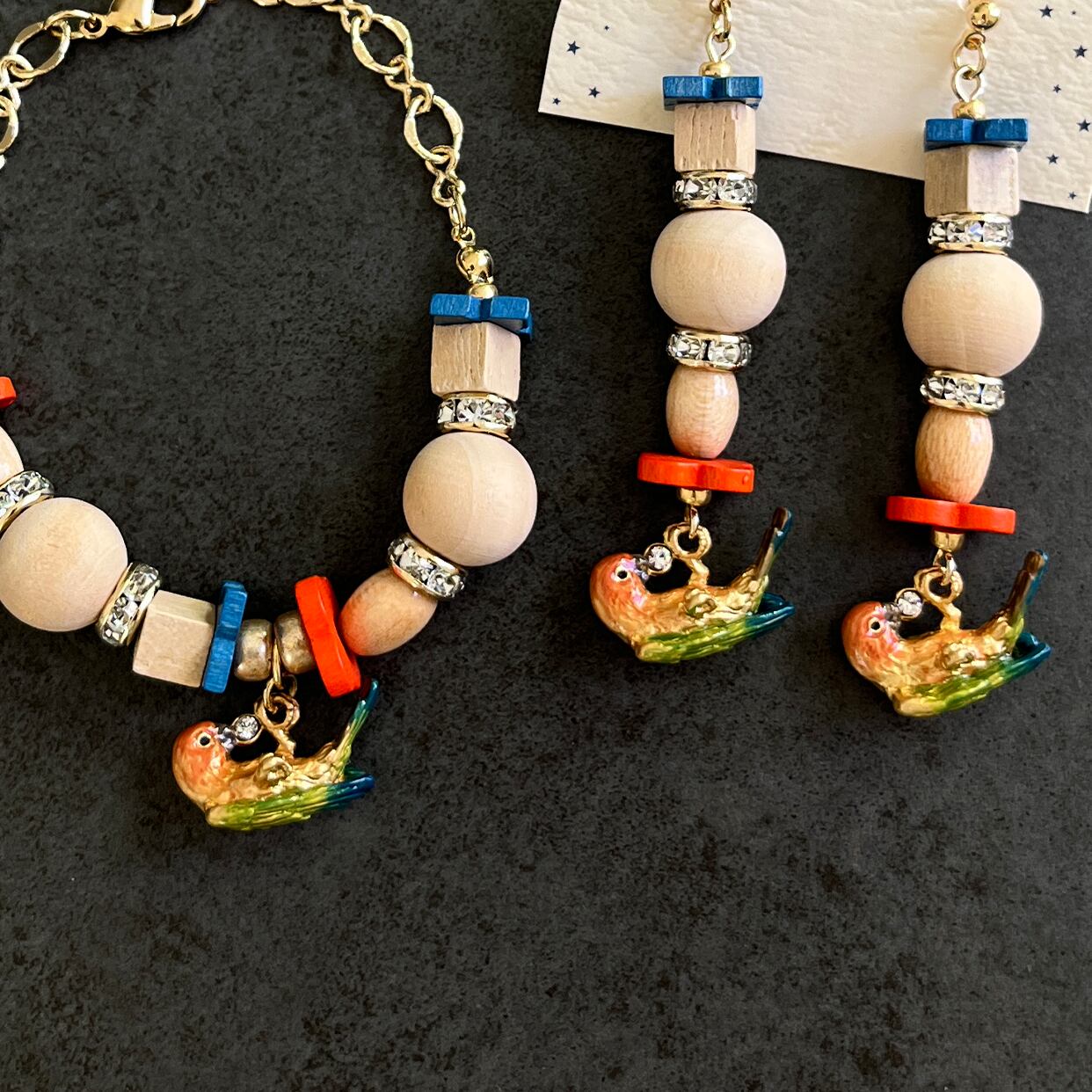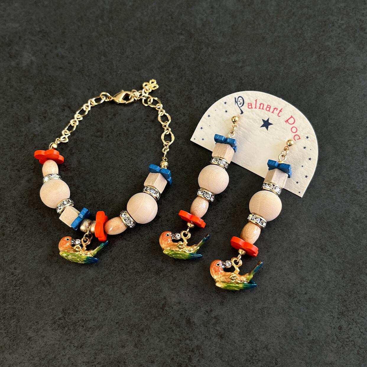 赤・青・緑など鮮やかな羽色が特徴のコガネメキシコインコに合わせ、おもちゃに見立てた可愛らしい花形のウッドビーズを並べ、元気で華やかな印象を引き立てています。