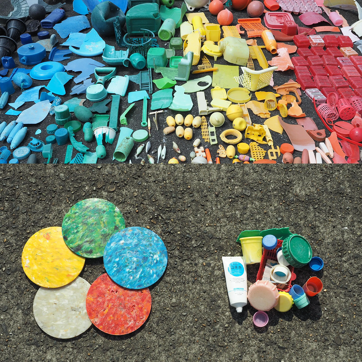材料はすべて着色せず海洋ごみの色を活かして成形しています。偶然生まれる色と模様は回収された漂着ごみによって決まります。