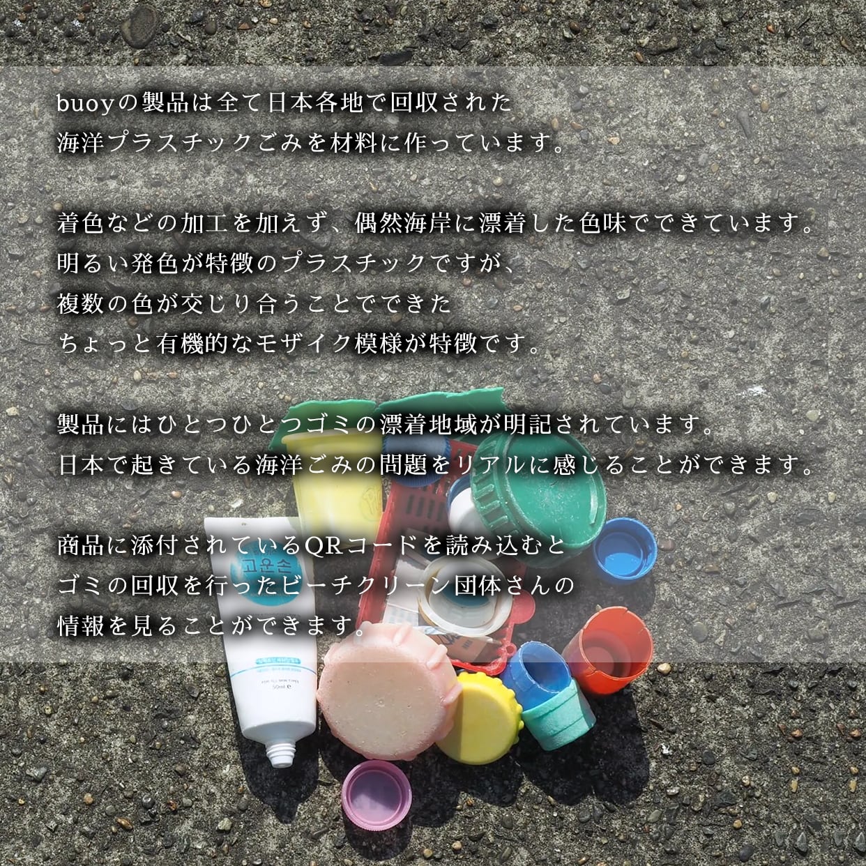 また、材料となった海洋プラスチックごみの漂着地域を産地として製品一つ一つに表記しています。