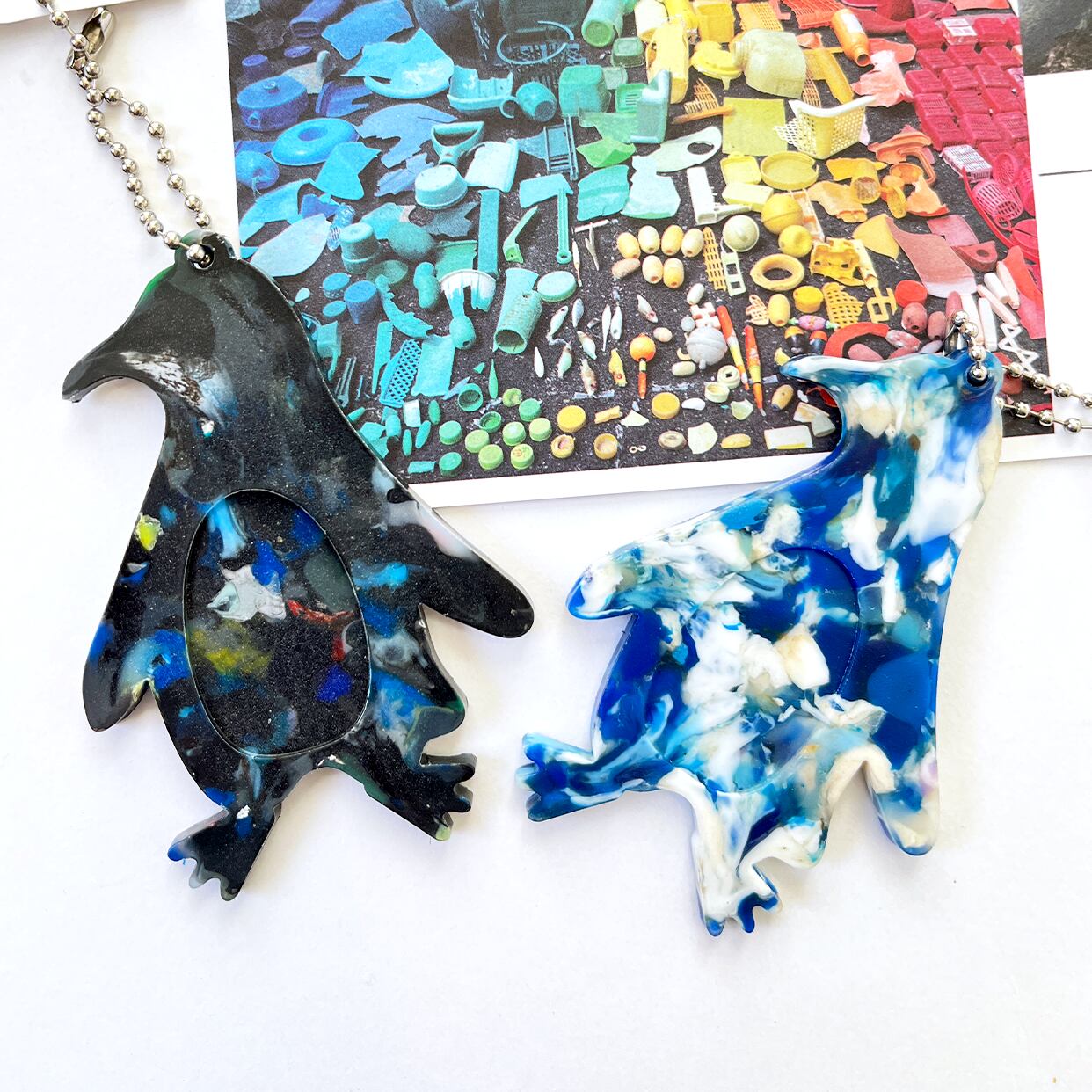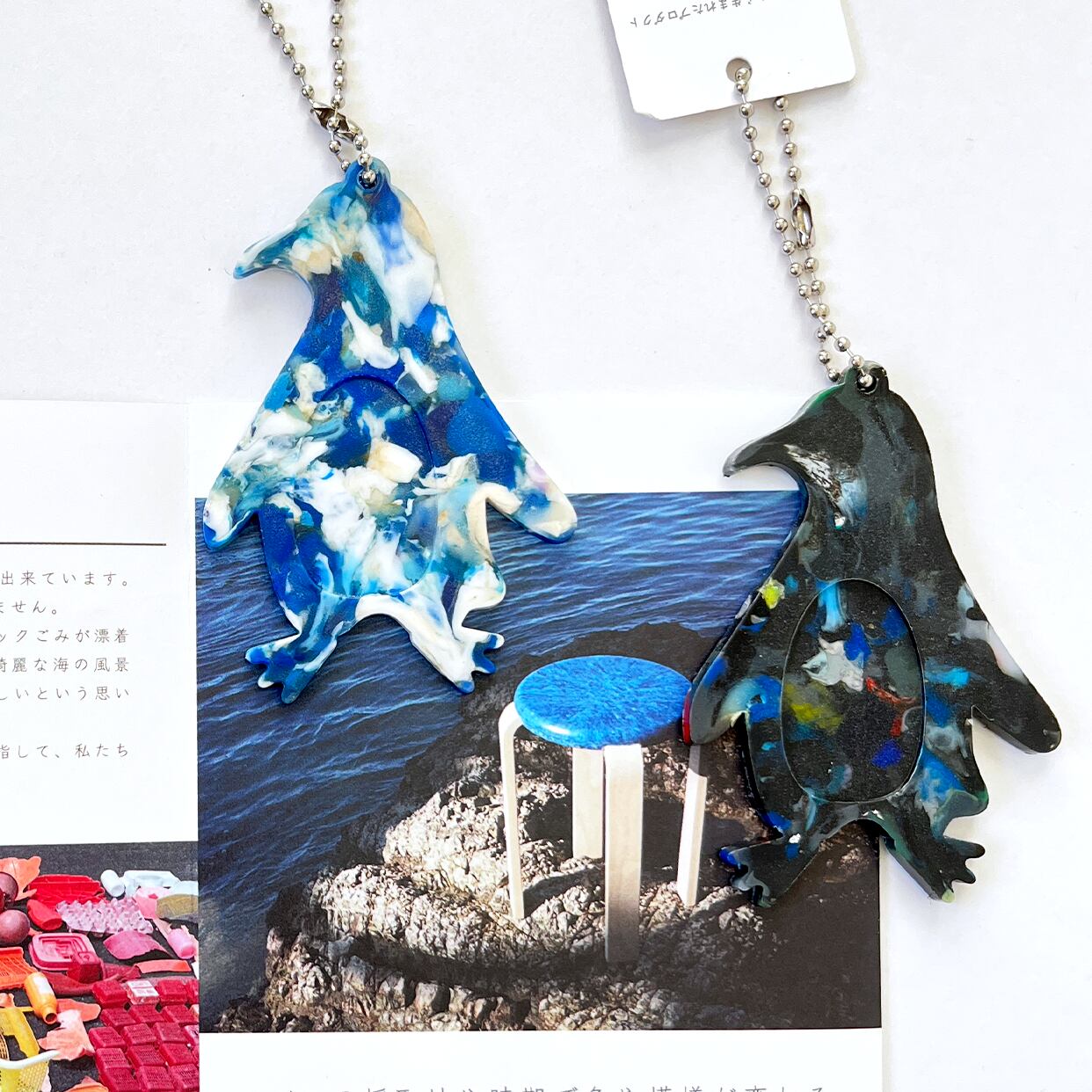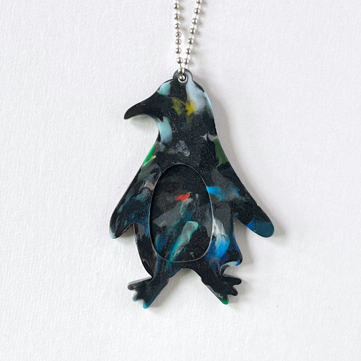 海洋プラスチックごみでできた、ペンギン型のシンプルなキーホルダー。