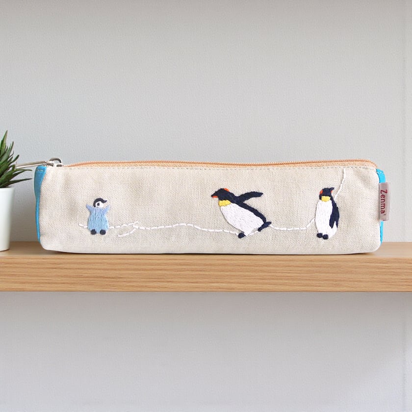 《鳥/ペンギン》 ペンケース ペンギン親子 ポーチ ハンドメイド 手刺繍