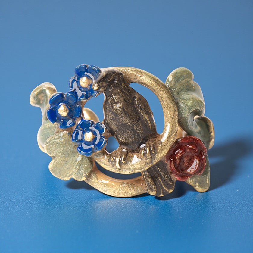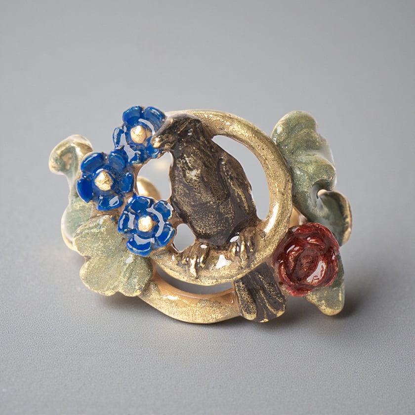 青い花や薔薇が咲く蔦を止まり木に、羽を休めるカラスの姿がどこか神秘的なデザインです。